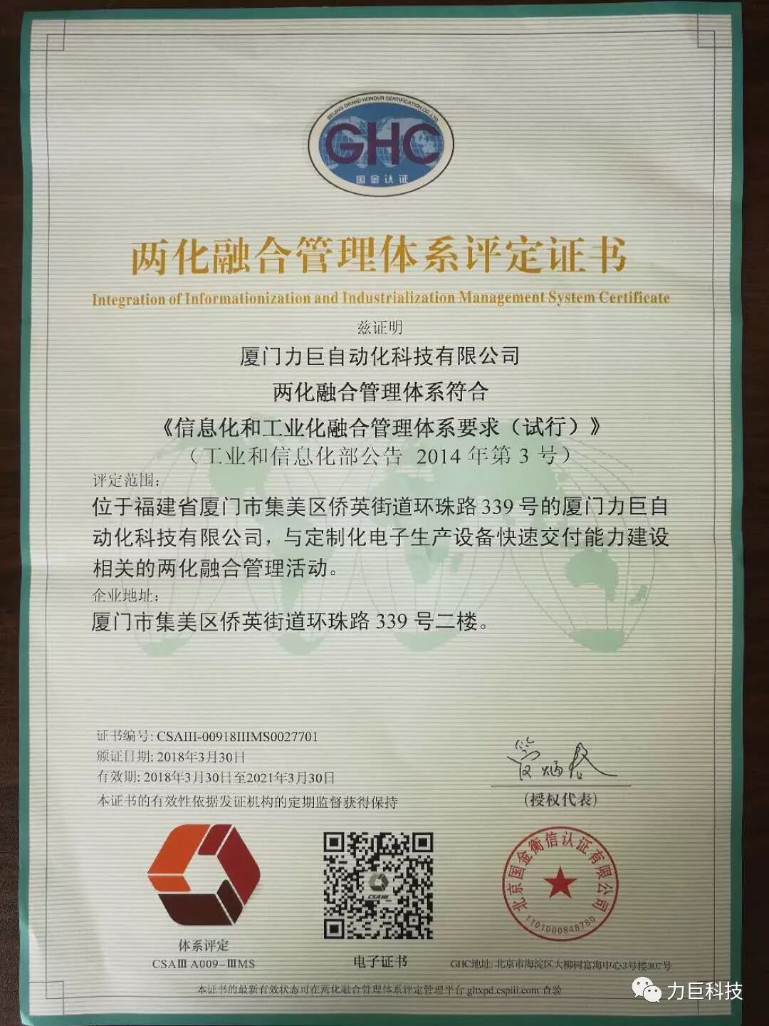 经过层层筛选与讨论,通过内部审核、管理评审、评定初审以及终审,最终以“定制化电子生产设备快速交付能力”于2018年首批顺利通过了两化融合管理体系的评定考核。这不得不说是对力巨科技这么多年坚持的一个巨大鼓舞,是国家工信部对力巨科技的重要肯定,也是对其未来企业战略目标落地的鞭策。