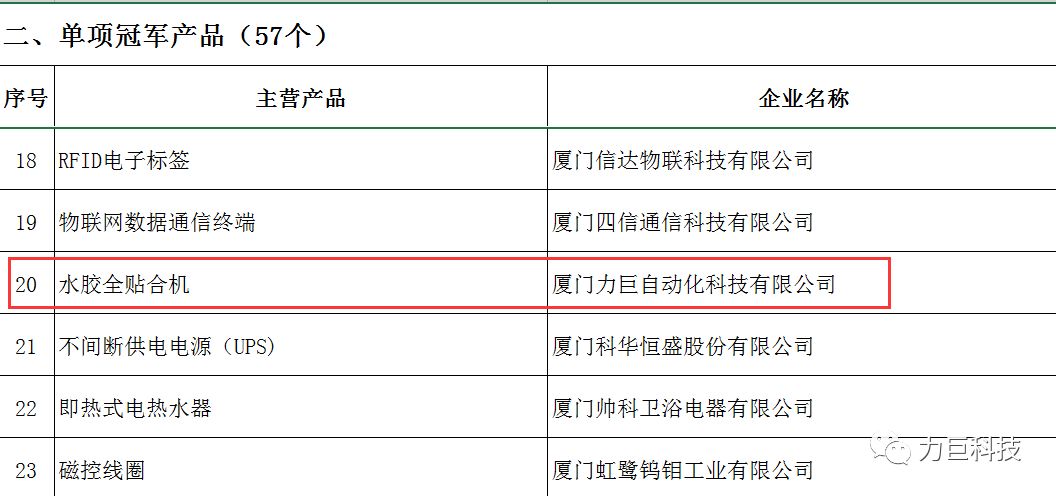 2018年9月6日,福建省经济和信息化委员会公布福建省第二批制造业单项冠军企业(产品)名录,有11家制造业单项冠军企业、57个单项冠军产品入选。其中,厦门力巨自动化科技有限公司的“水胶全贴合”产品有幸入选。