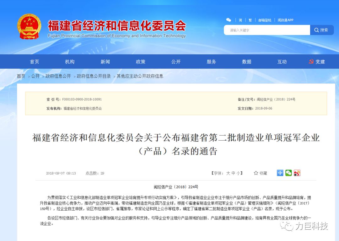喜讯丨力巨科技被评为福建省制造业单项冠军