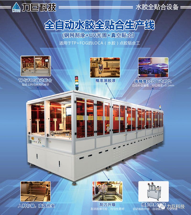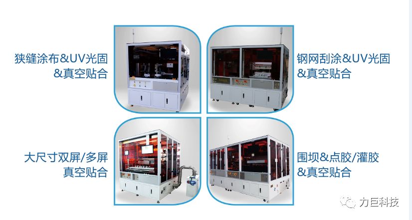 力巨科技推出狭缝涂布全贴合、刮涂贴合一体、围坝+点胶全贴合、围坝+注胶全贴合、多屏全贴合等多种针对水胶全贴合方案,满足车载屏/工控屏的需求,是目前国内水胶全贴合解决方案最多最全的设备厂商。