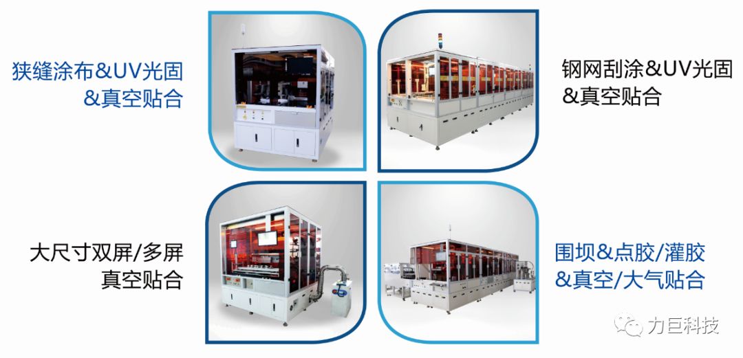 力巨科技推出狭缝涂布全贴合、刮涂贴合一体、围坝+点胶全贴合、围坝+注胶全贴合、多屏全贴合等多种针对水胶全贴合方案,满足车载屏/工控屏的需求,是目前国内水胶全贴合解决方案最多最全的设备厂商。