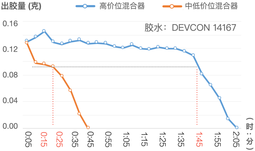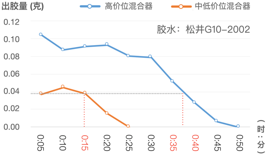 而高价位混合器的降幅则平缓许多,有比较长的出胶稳定期。