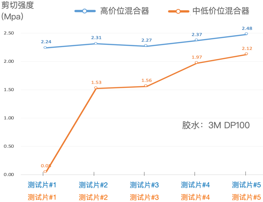 中低价位混合器的平均剪切强度仅仅比高价位混合器低了11%。可以说,大家在胶水混合均匀度方面的表现已经是非常接近了!