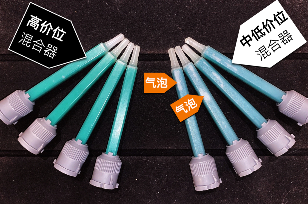 当胶水注入中低价位混合器时,内壁总是会出现一些肉眼可见的巨大气泡!这显示胶水在混合器内部的流动并不如预期那般顺利。